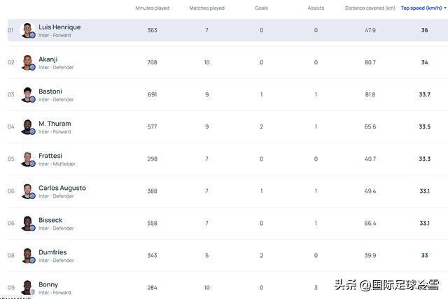 这也是阿坎吉(最高时速34.0公里/小时)在国米很难获得轮休的原因,因为他能提供的移动防守能力,其他人很难保证。